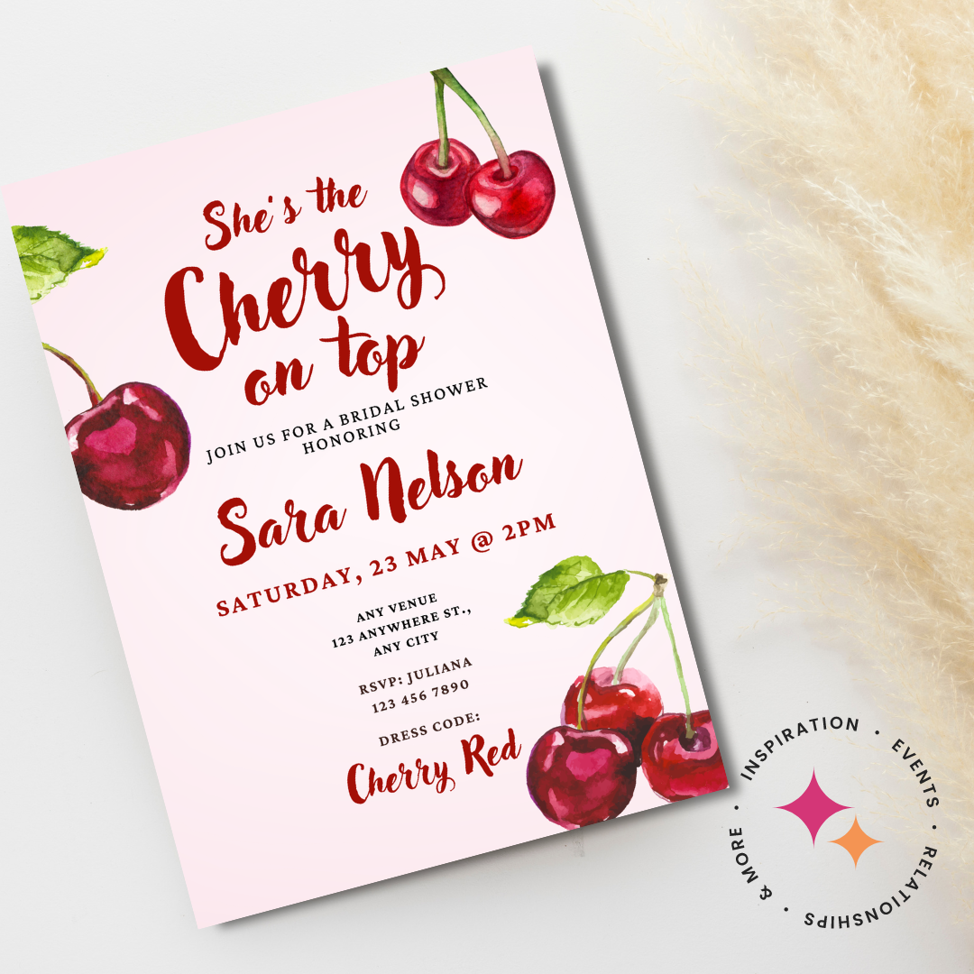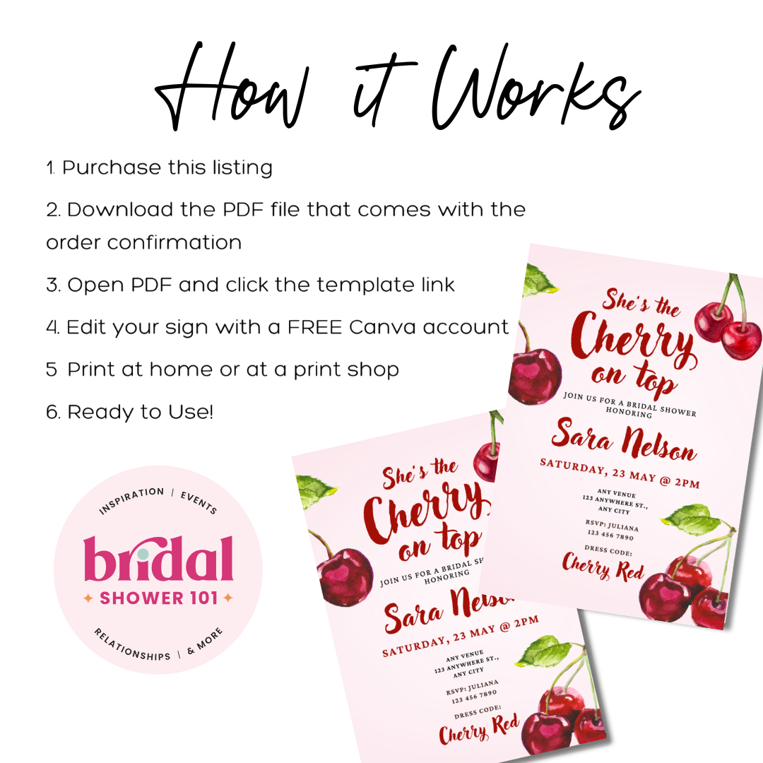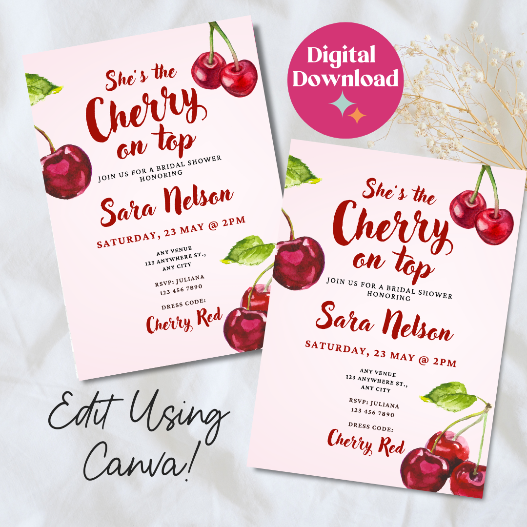 Fully editable in Canva, you can easily customize the text, colors, fonts, and layout in minutes—no design experience needed. Ideal for digital sharing or printing, this invitation is the perfect finishing touch for a bridal shower that’s truly the cherry on top.
